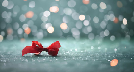 A red ribbon bow rests on a sparkling teal surface, creating a festive holiday atmosphere. Perfect for cards.