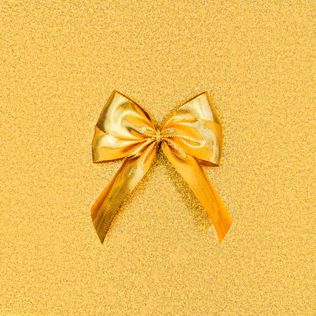 Close up gold foil bow in middle of square shiny shimmering golden sequined backdrop,copy space.Promotion gift to first customer.Christmas,New Year,birthday decor.Holiday,celebration,sales pattern.