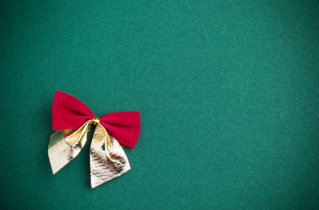 bow for a holiday gift with a branch of spruce pine on a green background close up with copy space new year Christmas