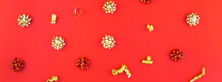 Christmas background. New Year or Christmas flat lay top view Xmas holiday celebration decorative golden pattern on red background with copy space. Template of greeting card