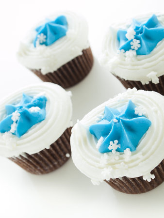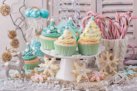 Christmas cupcake on blue background with copy