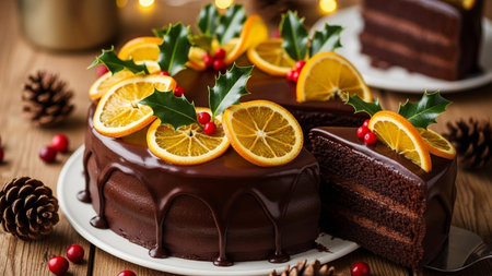 Chocolate cake with oranges and holly on a wooden table.