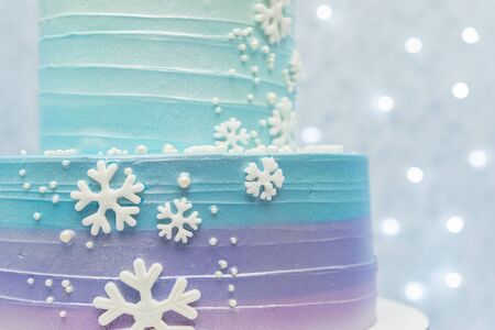 Two tier cake on blue background with unfocused lights