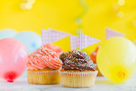 Happy Birthday day cupcake and cake bakery with candles, bright lights bokeh. Background holiday with confetti, balloon and place for text.