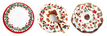 Christmas cakes decorated with cranberries and rosemary isolated on white, set. Top view