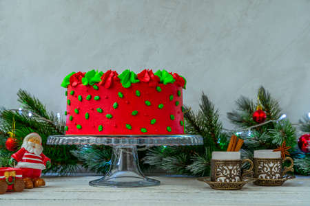 Christmas cake made of chocolate base with cream, decorated with berries and fruits on the background of candles, garlands, fir branches and cones