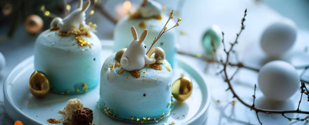 Three exquisite Easter bunny cakes, adorned with gold leaf and delicate decorations. A perfect springtime dessert.
