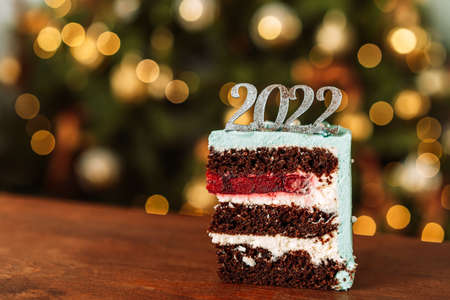 Piece of Christmas cake with the inscription 2022 in front of the tree.