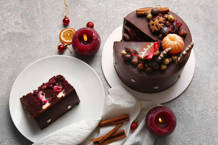 Composition with tasty Christmas chocolate cake and candles on gray background