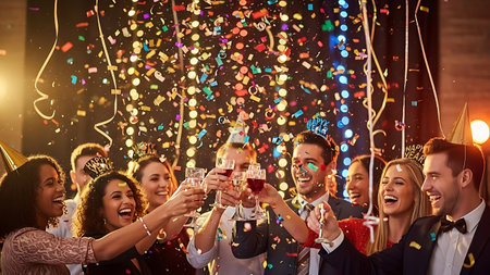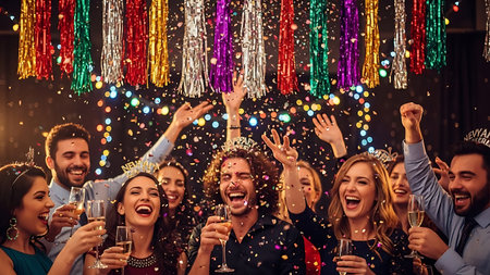 A vibrant and joyful group of people celebrating New Year's Eve. They are surrounded by colorful confetti and bright lights, capturing the excitement and happiness of the moment.