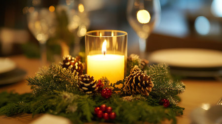 A beautifully arranged festive table with a candle, pine cones, and seasonal greenery, creating a warm and inviting atmosphere perfect for holiday gatherings.