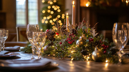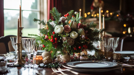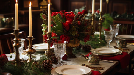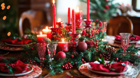 Holiday table setting with traditional Christmas decorations, including red candles, holly, and a festive centerpiece. Perfect for a Christmas feast.