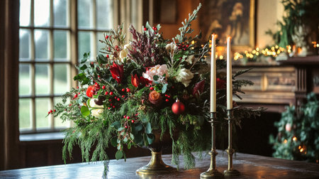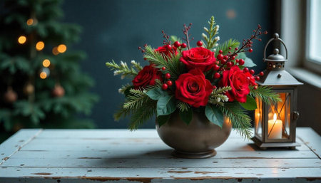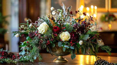 Christmas floral centerpiece featuring red roses, white lilies, and evergreen branches on a dining table. warm candlelight enhances the cozy holiday atmosphere, making it ideal for festive decorations and joyful gatherings.
