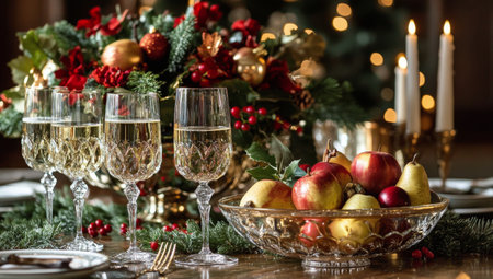 An inviting holiday table is beautifully arranged with crystal glassware, seasonal fruits, and festive decorations. The warm lighting enhances the cozy feel perfect for celebrating.