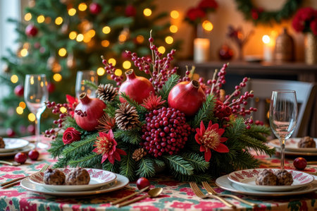 Festive christmas table with pomegranate centerpiece and holiday decor. That the image is generated using AI.