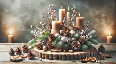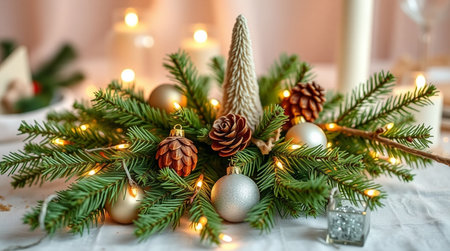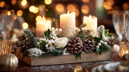 A beautiful Christmas centerpiece featuring elegant candles surrounded by pine greenery and festive ornaments, perfect for holiday gatherings and celebrations.