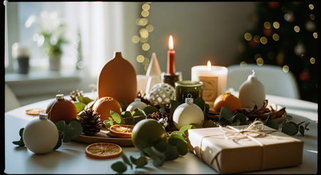 A beautifully arranged festive table setting with candles, ornaments, pine cones, and dried oranges, creating a warm holiday atmosphere