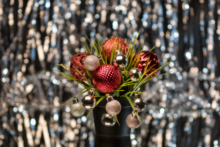 Christmas arrangement with Norwegian pine Nobilis and decorated with Christmas decor in a metal Cup Garland bokeh on background Christmas love Dark wooden table sprinkled : Generative AI