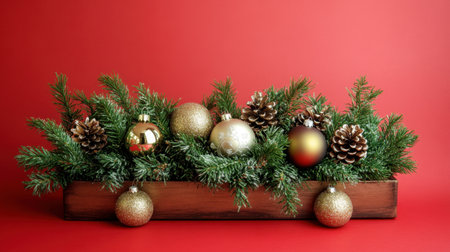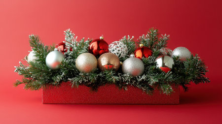 A beautiful Christmas gift box with glittering ornaments and green fir branches, set against a bright red backdrop, creating a festive and elegant holiday atmosphere.