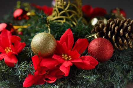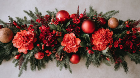 Beautiful arrangement featuring red flowers, lush greenery, and shiny ornaments, perfect for adding a festive touch to any holiday celebration or winter d