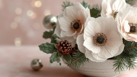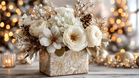 This elegant white floral arrangement features soft petals and pinecones, perfect for holiday decor. The dreamy bokeh background enhances its beauty for celebrations.