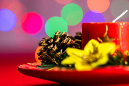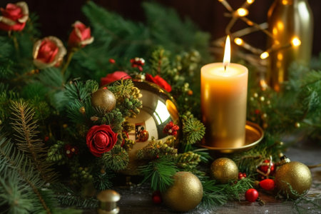 Christmas and New Year decoration with fir branches, cones, lights and candles
