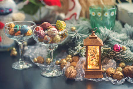 Holiday Christmas decoration still life with colorful walnuts, selective focus