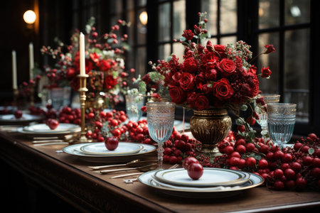 Elegant rose and berry centerpiece at formal dining event with glassware. That the image is generated using AI.