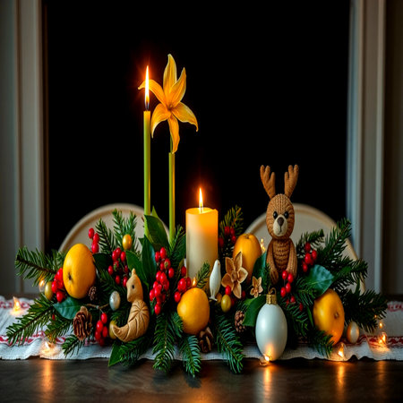 Christmas decoration with burning candles, tangerines, holly berry on a dark background