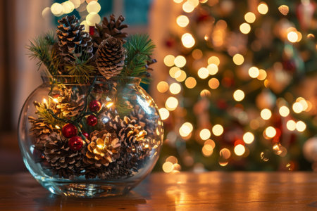 A beautifully arranged glass bowl filled with pinecones, berries, and twinkling lights sits on a rustic table, with a sparkling Christmas tree adorned with ornaments glowing softly in the background.