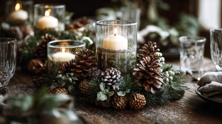 A beautiful rustic holiday table centerpiece featuring glowing candles surrounded by pine cones and greenery, creating a warm and inviting atmosphere perfect for celebrations.