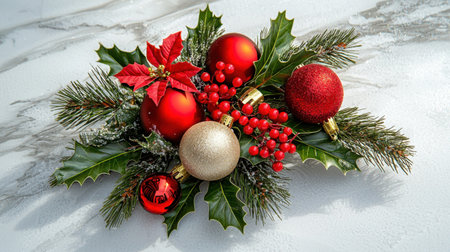 Bright and festive arrangement featuring red and gold ornaments, vibrant berries, and lush greenery. Perfect for capturing the essence of holiday celebrations.