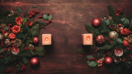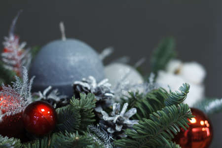 Christmas and New Year background with fir branches, Christmas decorations and candles