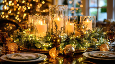 A beautifully arranged holiday table setting featuring glowing candles amidst lush greenery and sparkling ornaments, creating a warm and inviting festive ambiance.