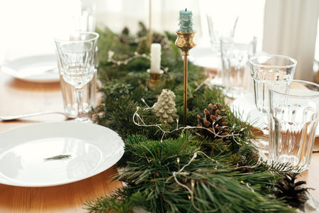 Christmas table setting. Rosemary branch on plate, vintage cutlery, candles, fir branches with golden lights and pine cones on table. Atmospheric Holiday arrangement