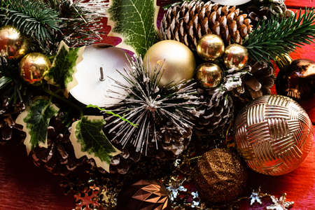 Festive Floral Arrangement with Candles and Baubles for Christmas