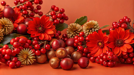 Red and gold fall decor with berries, flowers, and ornaments on an orange background.