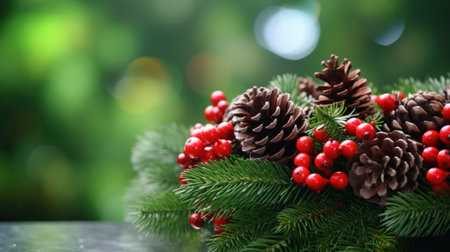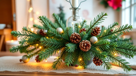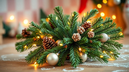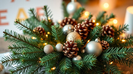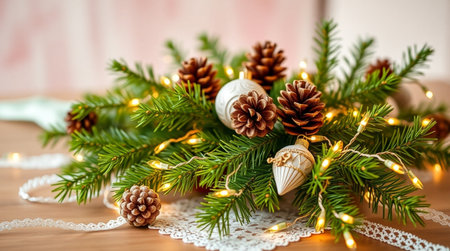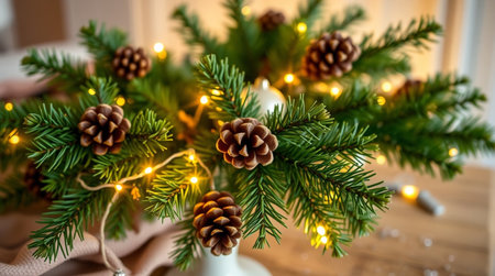 Christmas and New Year decoration with pine cones, fir branches and lights
