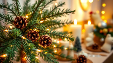 Christmas tree branches with pine cones, garland and candles on blurred background
