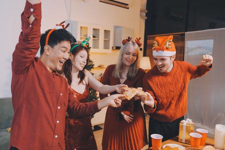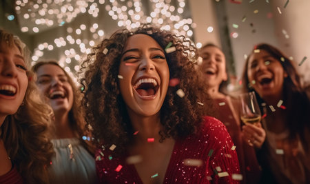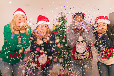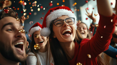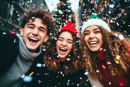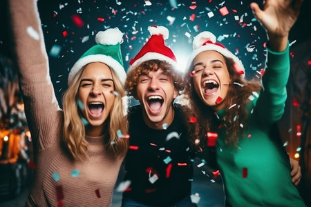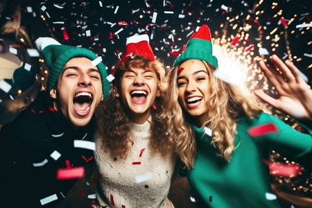 Friends both man and woman or young people are gathering for Christmas and New Year holiday, spending quality time together, throwing confetti, and celebrating the happiness festival