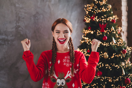 Portrait of nice young woman raise fists triumph wear sweater new year xmas time flat indoors