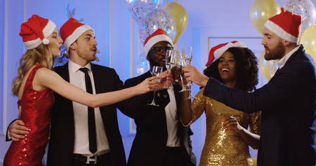Young multi ethnical friends in Santa Claus hats celebrating New Years Eve, having fun and clicking their glasses with Champagne at the New Years party. Indoors. Portrait shot