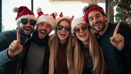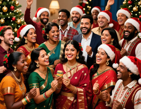 A vibrant group of friends celebrates Christmas with joy and laughter. Dressed in colorful festive attire, they create unforgettable moments filled with love and unity.
