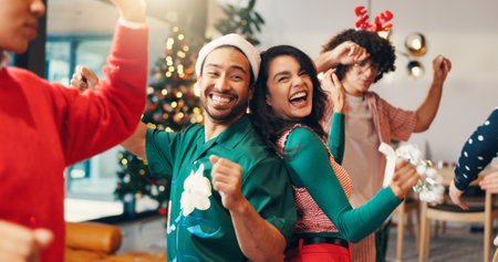 Happy people, Christmas and dancing with friends for party or new year celebration at home. Excited, group or energy with smile for December holiday, festive event or fun get together at house