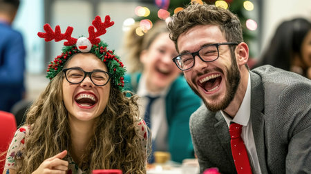 Holiday laughter in office photo booth capturing coworkers with festive props