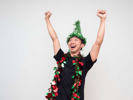 Young man happy and cheerful show arms and fist up with green hat and tassel colorful on white isolated happy new year concept celebration