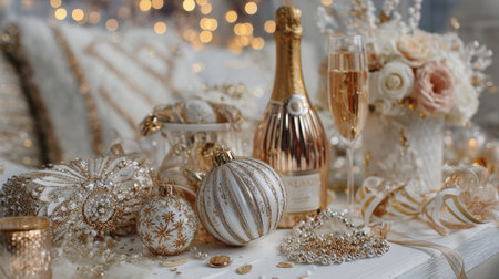 Captivating scene of an elegant celebration featuring champagne, golden and white ornaments, and beautiful floral arrangements, creating a warm and inviting atmosphere.