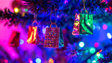 Christmas ornaments made from miniature shopping bags, hanging on a neon lit tree