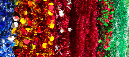 Bright sparkling background with various tinsels, red, blue, green at the Christmas market, tinsel shop, Christmas tree decorations