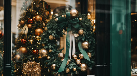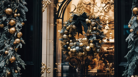 Christmas decoration details on English styled luxury high street city store door or shopping window display, holiday sale and shop decor inspiration